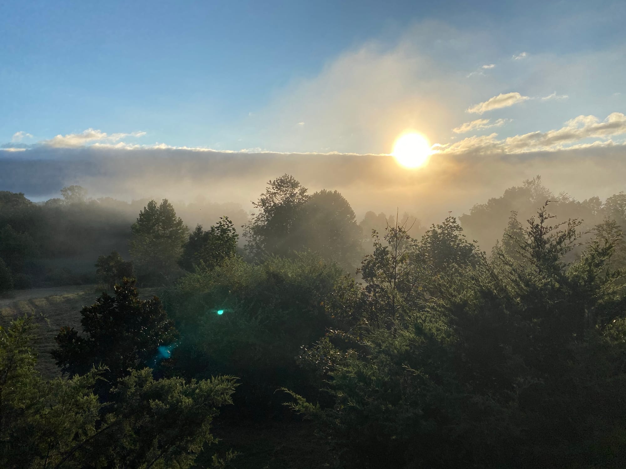 1) the wheels and the cabin 2) sun burning off fog from the porch, first morning